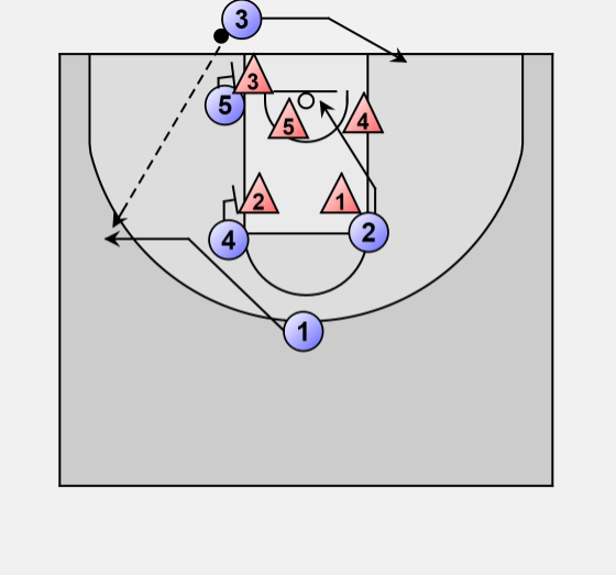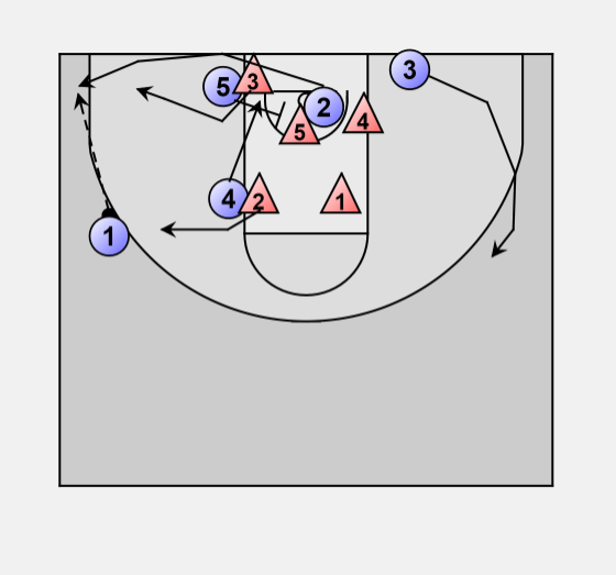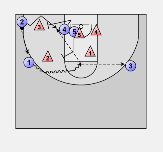 If the pass from 2 to 4 is not open, 5 moves up the paint to set a screen at the high post.
