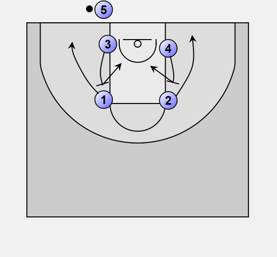 Block players 3 and 4 up screen for elbow players 1 and 2, who come off the screens to the corners, and the block players open to the ball in the lane.