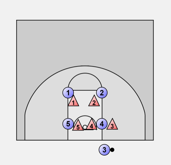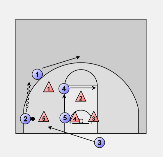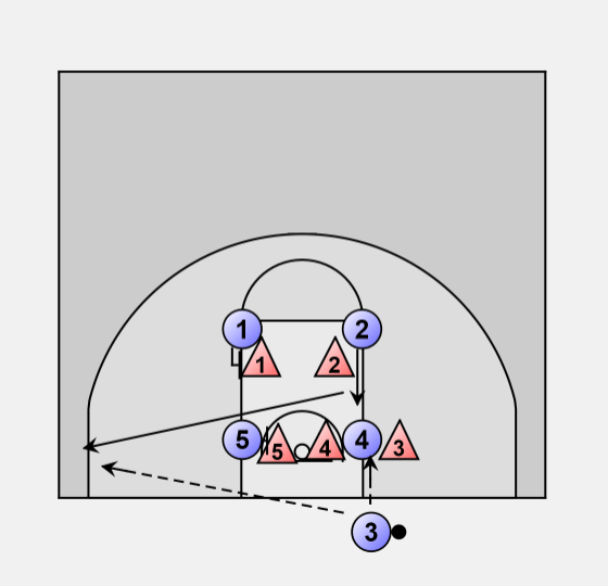 If D5 covers the dribble too high, 3 should be open in the short corner, for a pass and feed to 5 diving to the hoop.