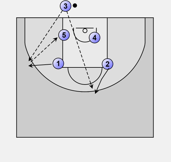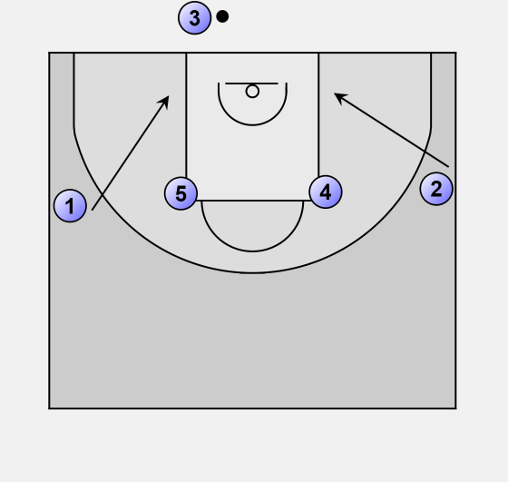 After setting the up-screen, 2 continues high looking for a 3 point shot, 1 cuts to the wing looking for the pass and post feed into 5.
