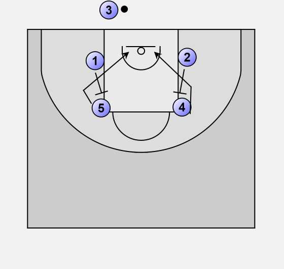 If these passes are denied, 1 and 2 set an up screen for 4 and 5 to cut to the ball.