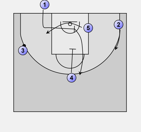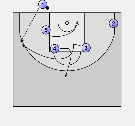 After passing 1 sets a screen on 5, who tries to get free in the low post.