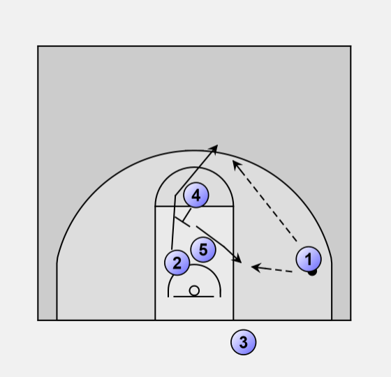 1 looks to 2 at the top of the key, then to 4 posting up.
