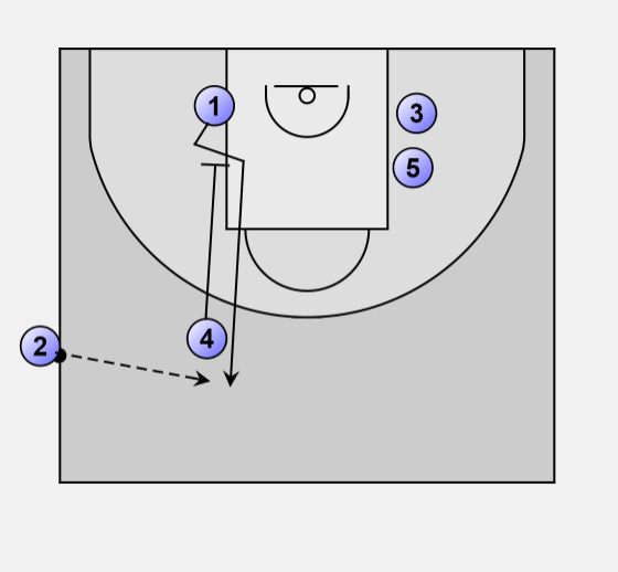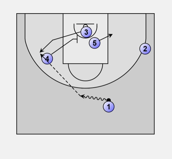 After player 1 cuts off screen, player 4 screens defender on inbounds allowing player 2 to cut, to the other side using the double screen by 3 and 5.