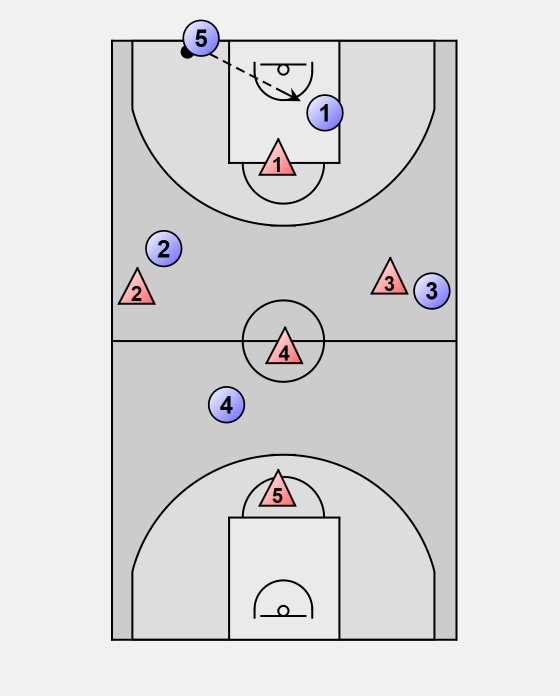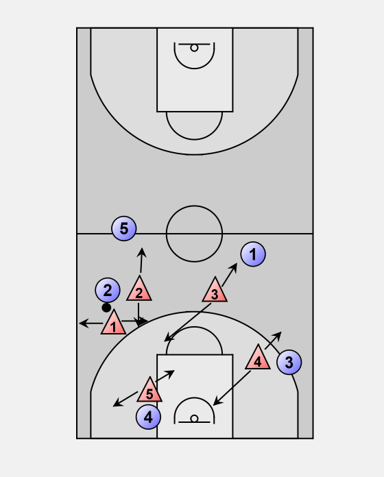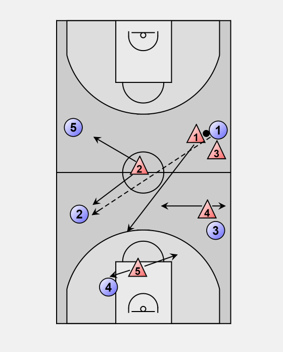 If a cross-court pass is made, 1and 2 double team at other side and force the offense to the sideline.