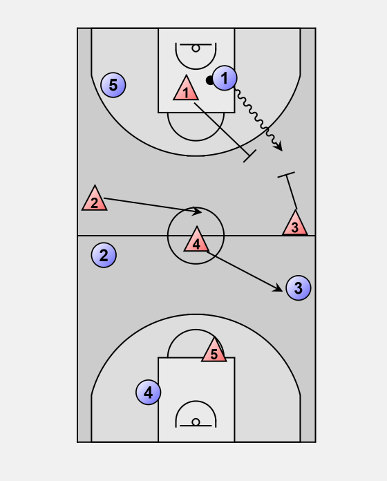 - After double-teaming at side 1 jumps off the ball sprinting back to match up with an open man there.