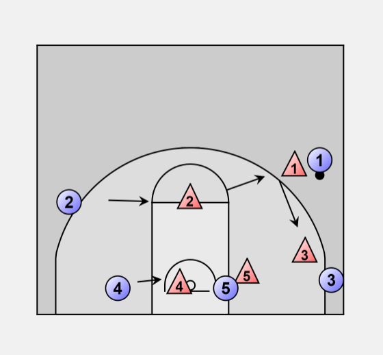 Let's say the 3 passes back to the 1 and goes to the corner followed by the one dribbling to the wing.