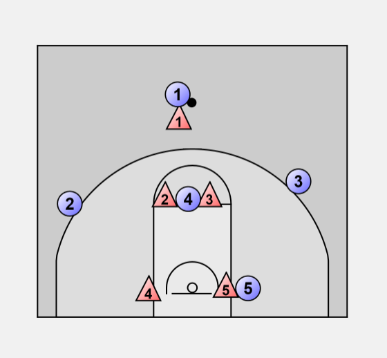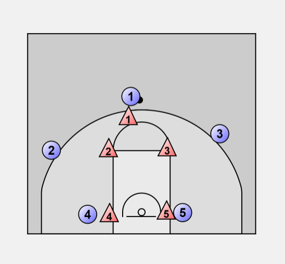 If they send a high post player the 2 & 3 close in on this player if the ball is at the top of the key.