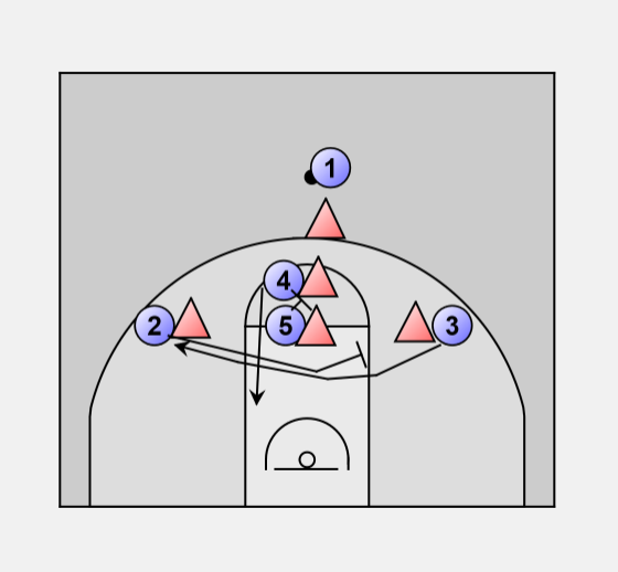 Note 1: (4) and (5) should be aligned slightly toward the side where the Wing will receive the pass from the PG so the defenders are positioned behind the offensive players when the pass is receiving by the Wing.