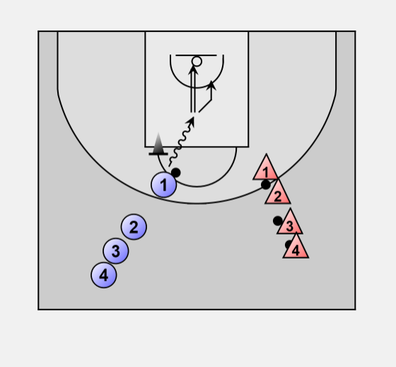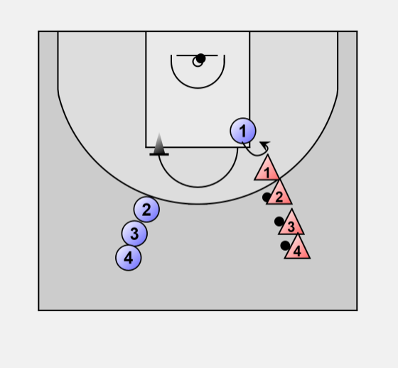 Shooter rebounds his own shot and makes an escape dribble to the active side.