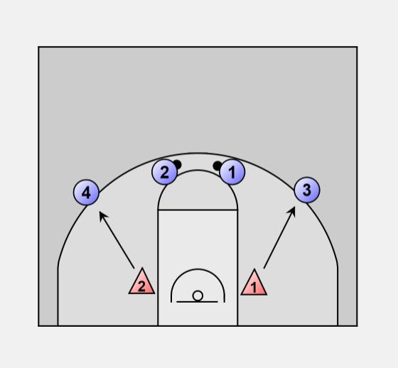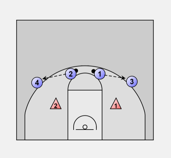 2. O1 passes to O3 and O2 passes to O4, these passes create the perfect amount of time for D1 and D2 to closeout and defend.