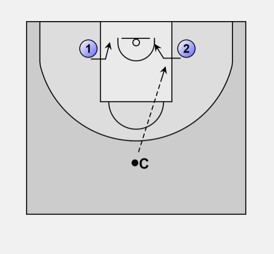 Players 1 and 2 start on the low block with their back to the coach.