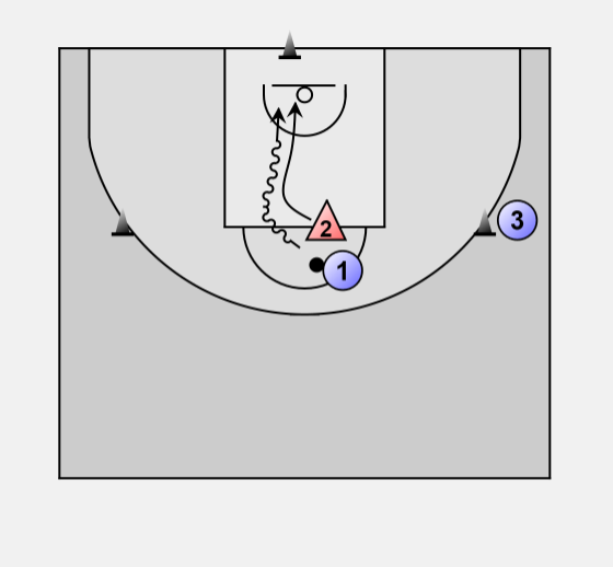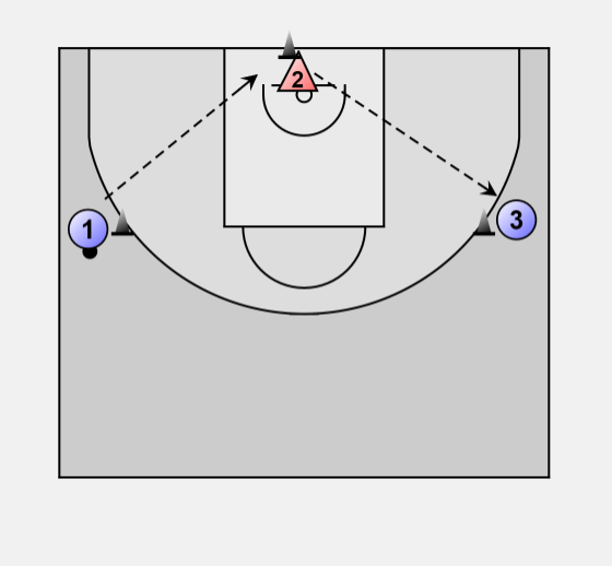 Work on a half court with a minimum of 3 players. The players are located at the pylons (one player under the basket and the other two at the crossing of the side line and the extended free throw line.