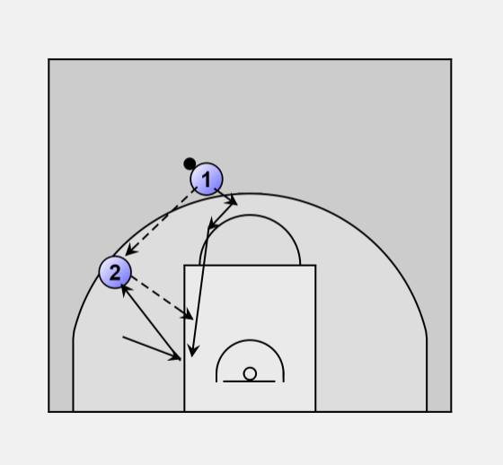 Perimeter moves from Wing - 2-on-0O1 passes to O2, who has completed a "V" cut (Slash-and-Seal), and cuts to the basket himself.