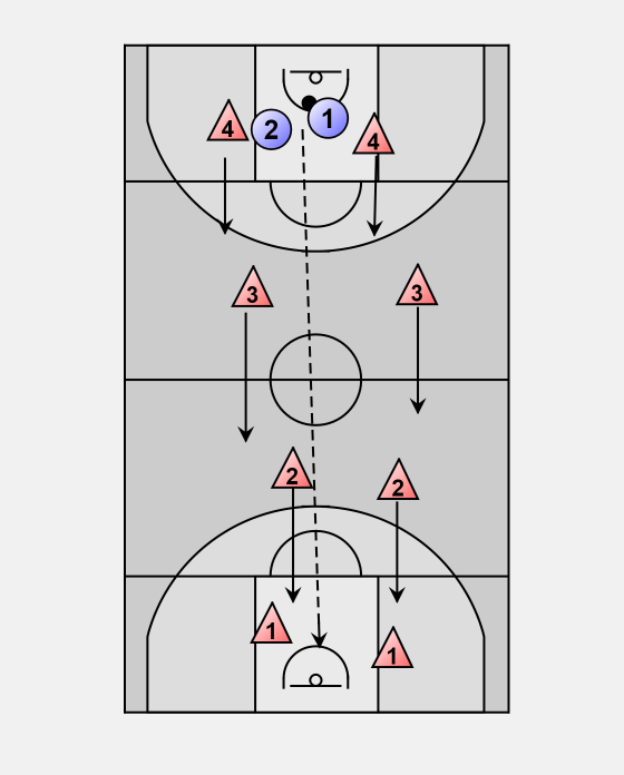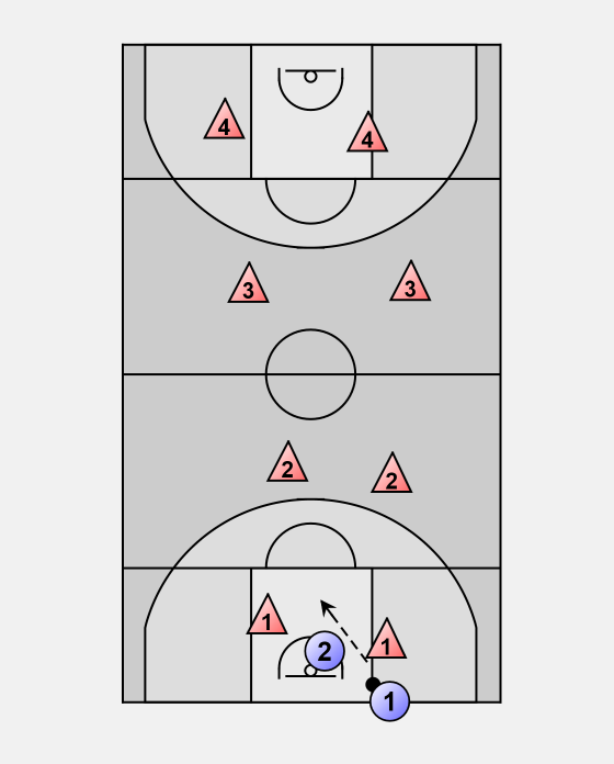 P1 and P2's goal is to take the ball to the opposite basket, by getting through the four zones.
