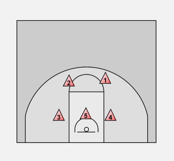"20" is our 2-3 zone. Here we have our guards ready to defend the three point line, and the back row of the zone should line up with the first marker above the block. This forces the offense to start further than they want.