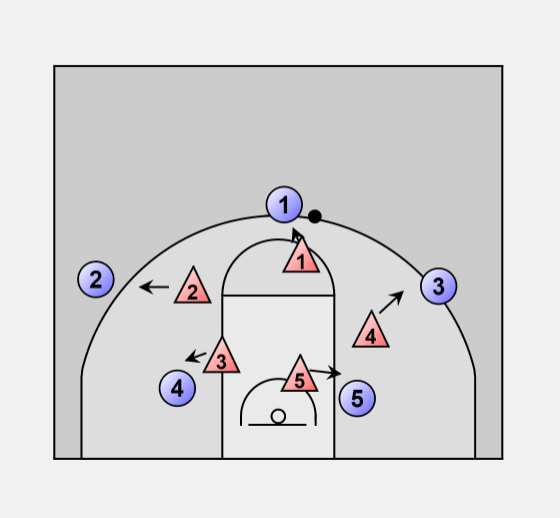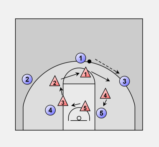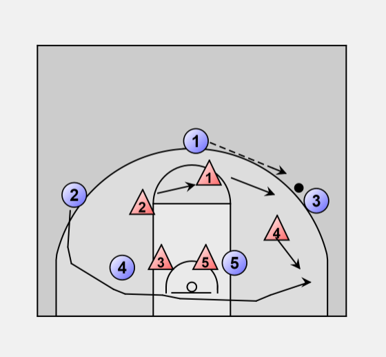 If 1 passes the ball to 2 the defense would stay with their matchups, but if 1 passes to 3 then BUMPING begins.