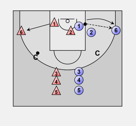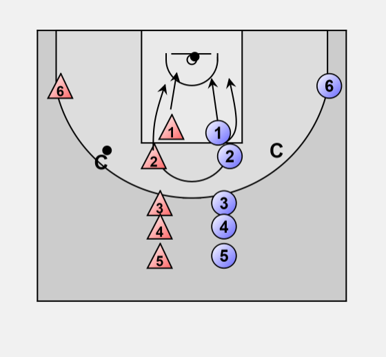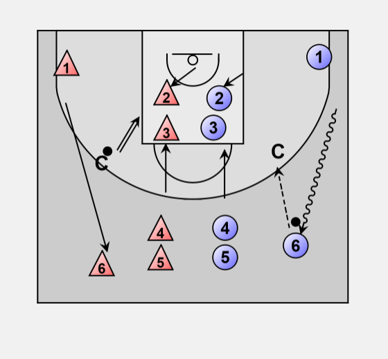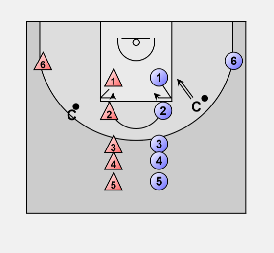 The coach (C on the right) without the ball receives the pass from the former wing player (6-red or 6-blue).