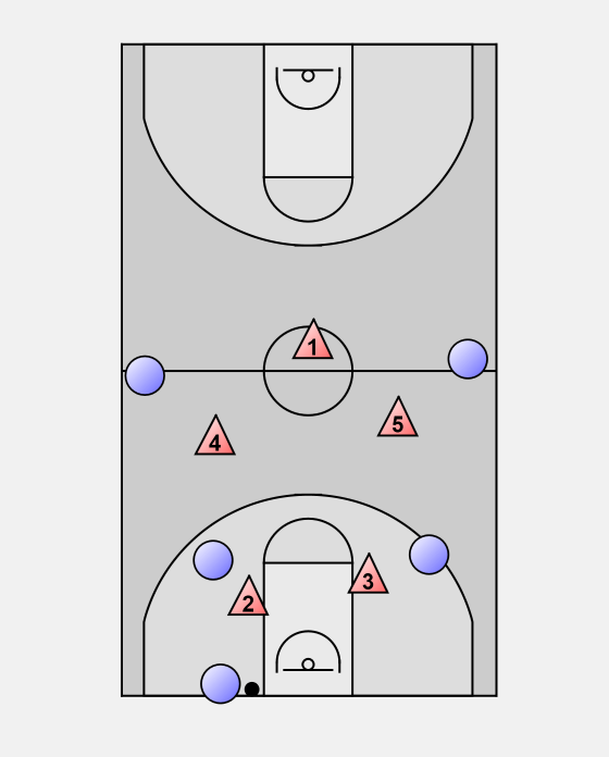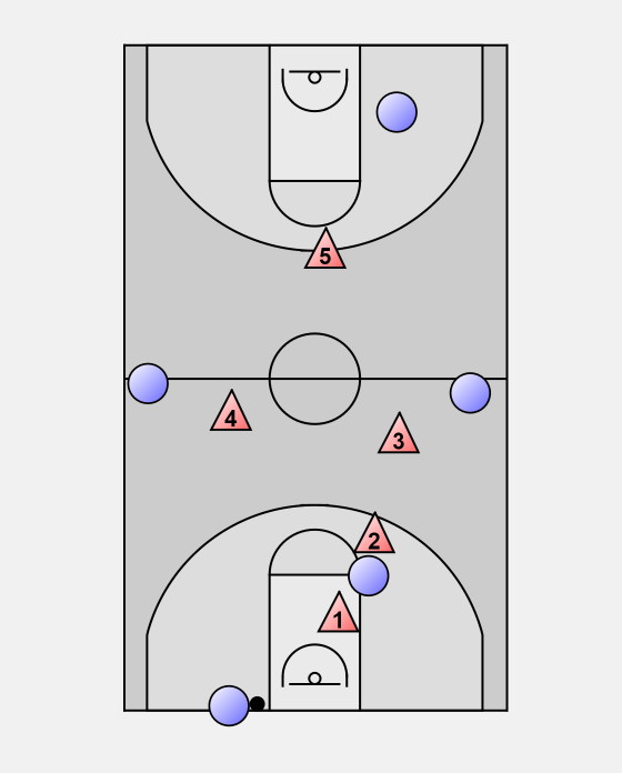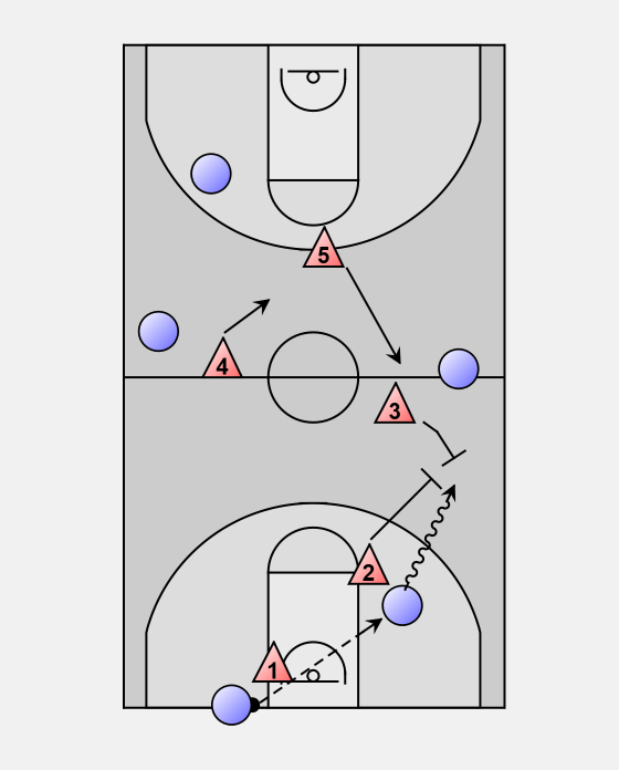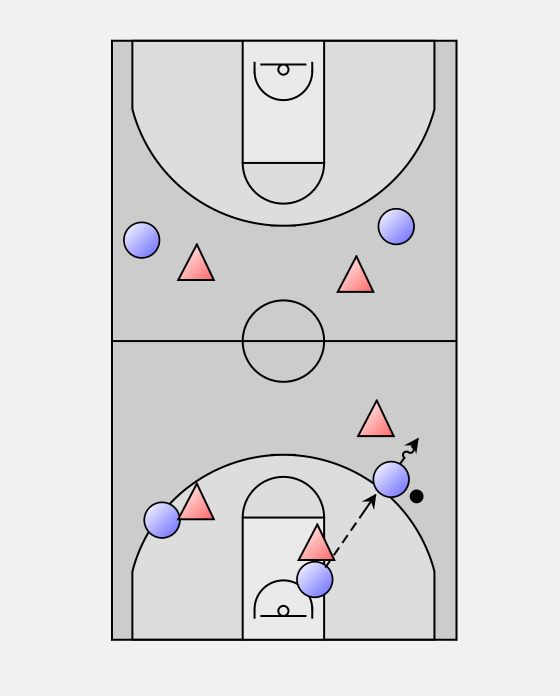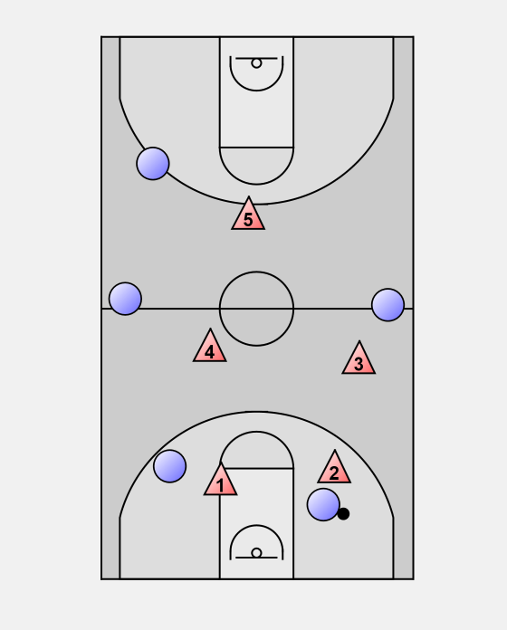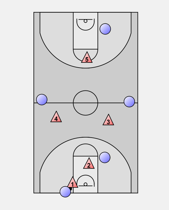 The on-ball defender then forces the dribbler sideline, or into making 3 or 4 changes of direction to slow her down, and smothers the ball handler if she picks up her dribble.