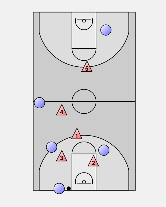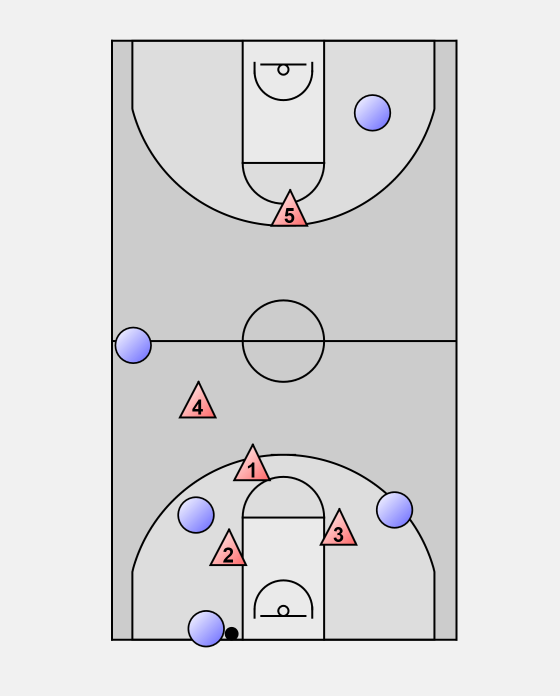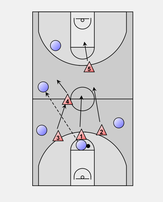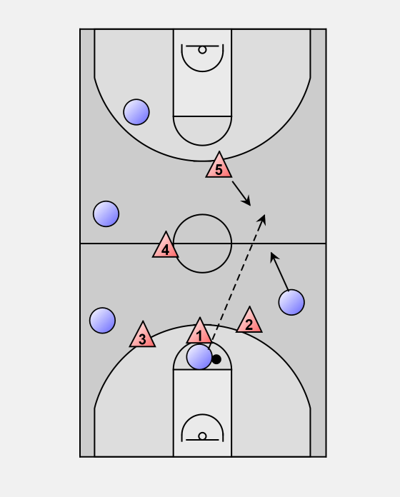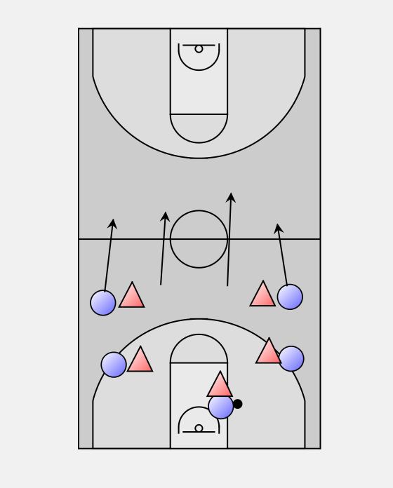The other defenders sprint back to the paint to protect the basket, and then pick up open players (build the defense from the inside out).