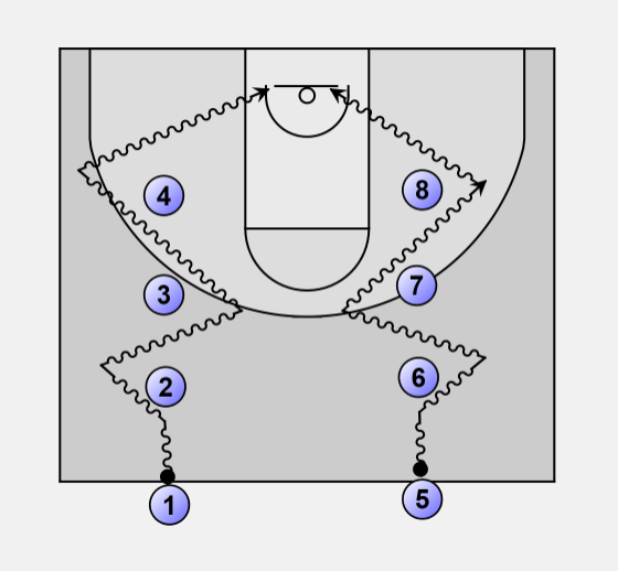 Players 2, 3, 4, 6, 7and 8 become "cones" for 1 and 5 to dribble through and at the end, execute a lay-up, and recover their rebound. When 1 and 5 recover their rebound after the lay-up 2 and 6 move up, receive a pass from 1 and 5 and conduct the drill.