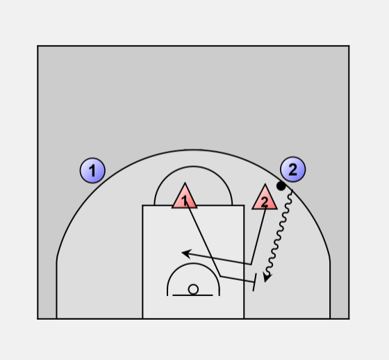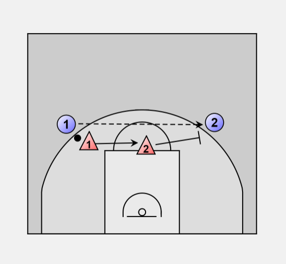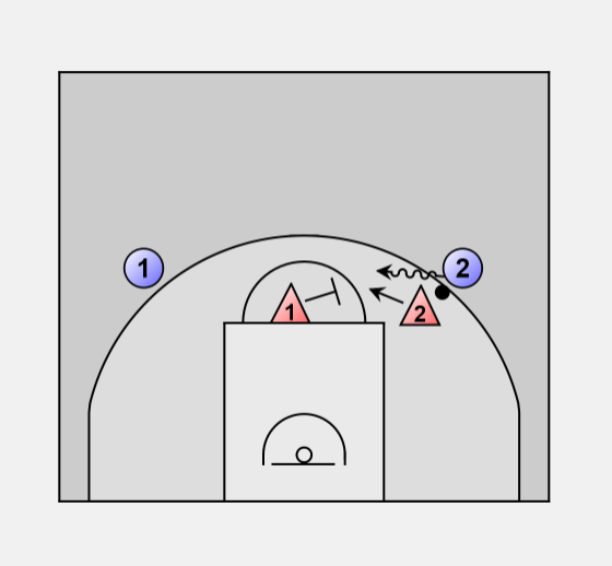 If offense #2 dribbles to the middle of the court defense #1 will help stop the dribble and fall back.