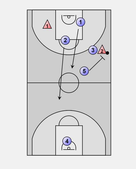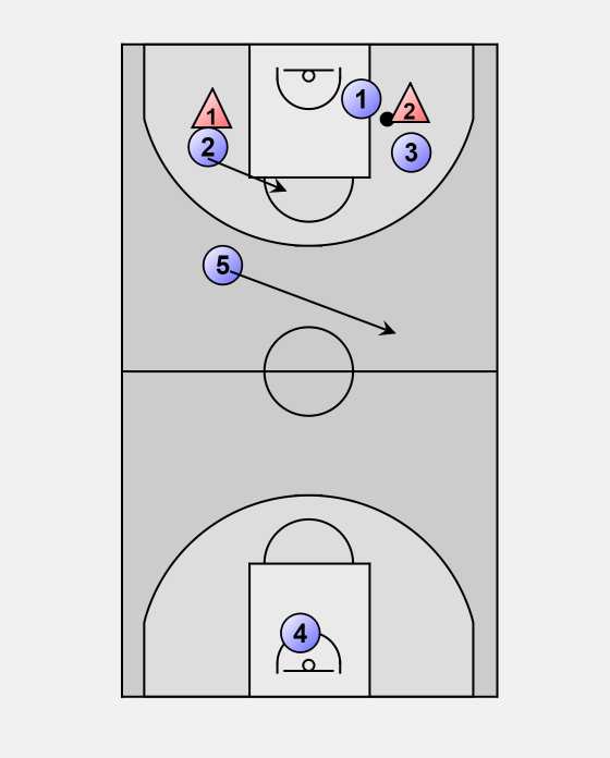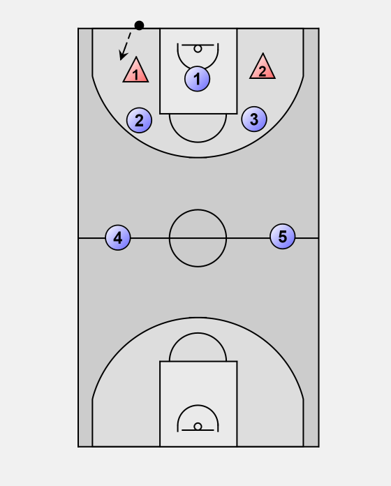 The ball is inbounded to the left side 1 and 2 will trap 3 will play the middle and 5 will come over also for more pressure in case the ball handler gets around 2 or for a steal on a pass.