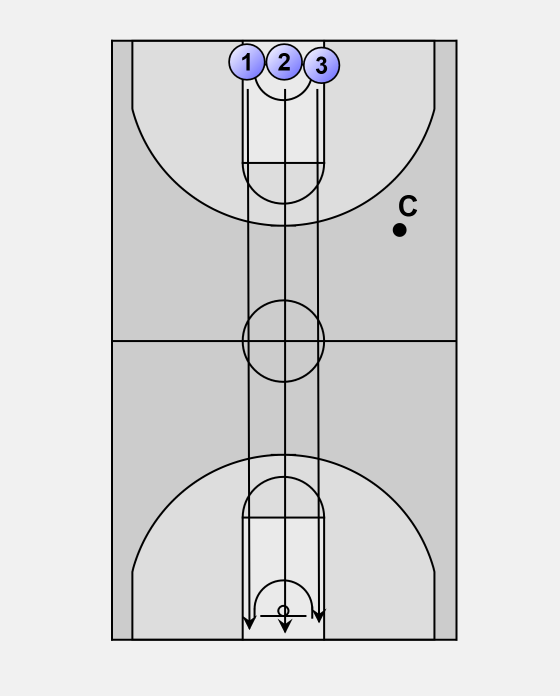 When the coach gives a signal, the three players run to the other side where they tip the baseline with their hand.
