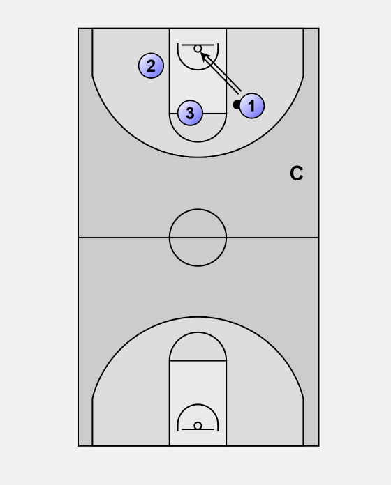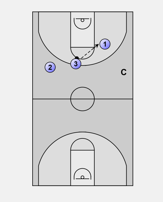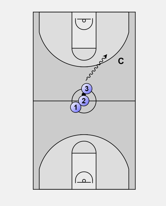 Player 3 tries to score (shot or lay-up). All three players have to contest the rebound.