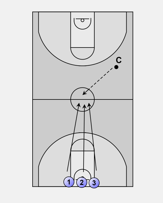 Coach yells 'ball' and passes to mid-court. Players run for the ball.