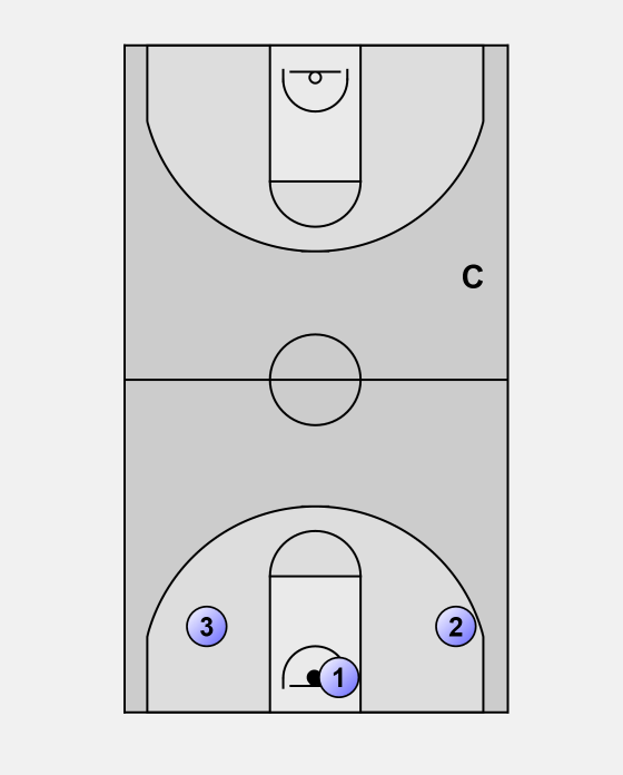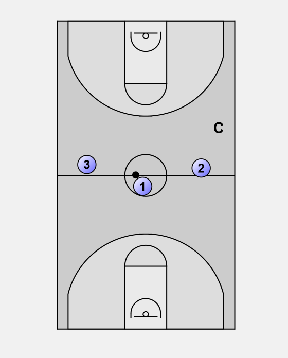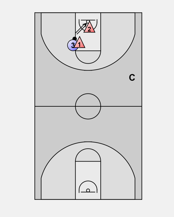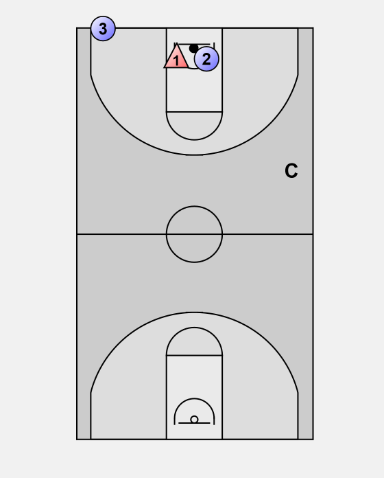 Player 2 tries to score, both players have to contest the rebound. Rebounder takes position in the middle, player who lost the rebound goes to the right wing.