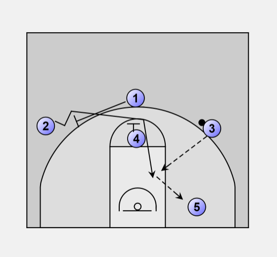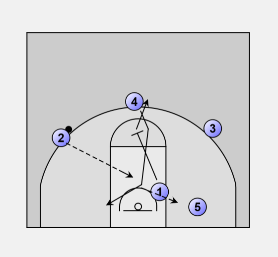 (1), if he does not receive the pass, will reverse and set a back screen for (4) cutting to the basket.