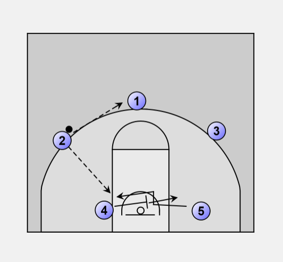 (4), if he receives the pass, can shoot or pass to (5). If he does not receive the pass, he will move to the weak side block.