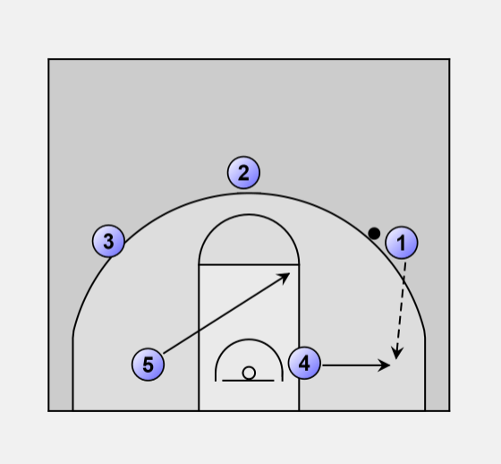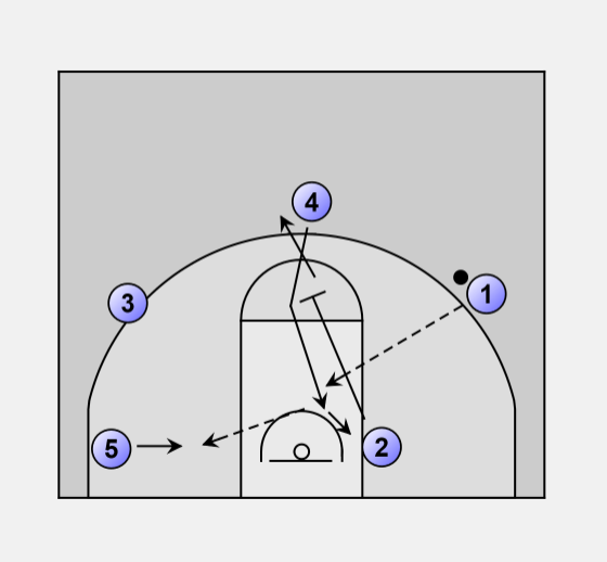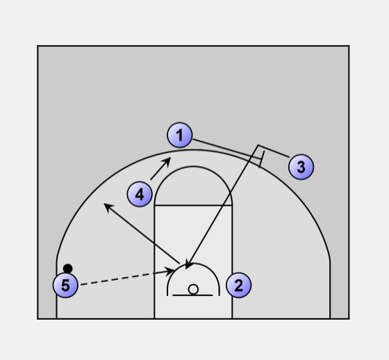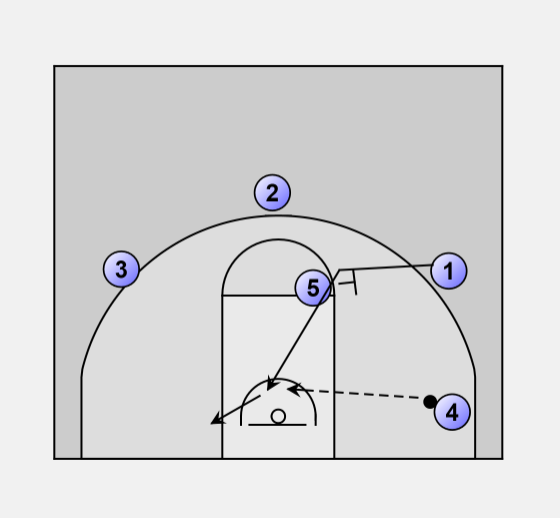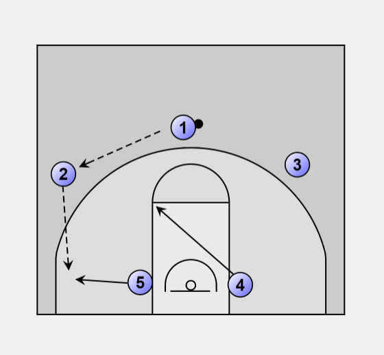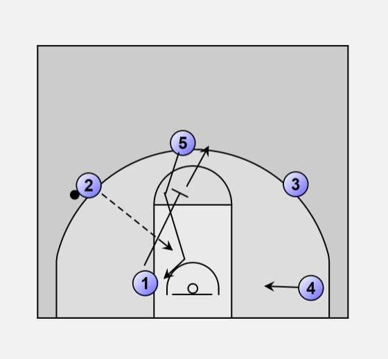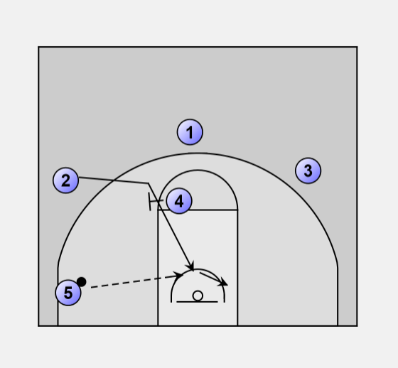 (1) will set a back screen for (5) cutting to the basket. (2) will attempt to hit (5) on the cut.