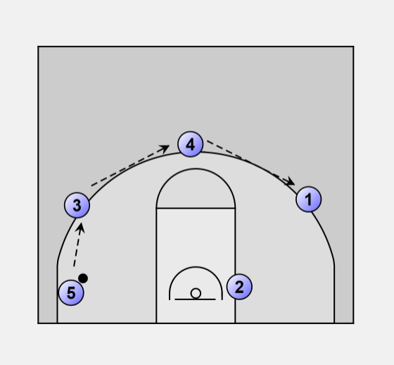 In this example, (5) will move to the short corner. If the play started with a pass to (3), (4) would move to the short corner.