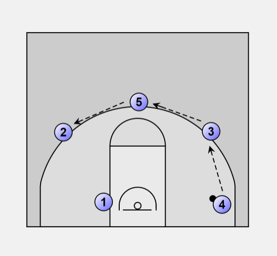 (4) will move to the ball side corner, since he is the closest post player to the ball. (5) will cut diagonally to the ball side elbow to set the initial screen.