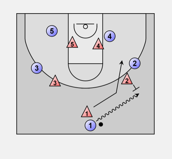Here are the positions after a jump switch. If ball handler O1 is expecting a trap, she may try to make a pass to O2 that can be intercepted by X1. O1 could also charge, travel, or pick up her dribble.