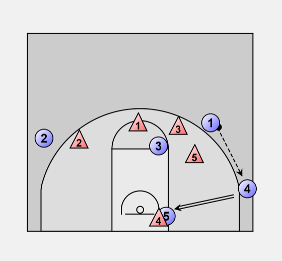1 man - come off screen set by 3 and draw help from the #5 defensive man and look to pass to a wide open #4 for 3 point shot.