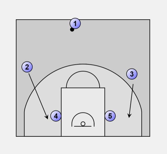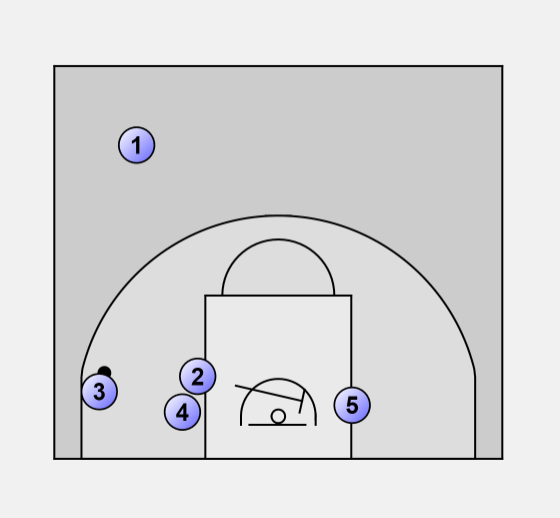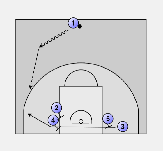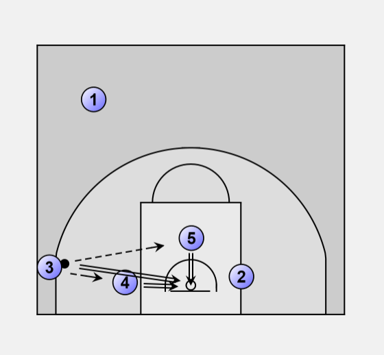 As player 3 clears the double screen. Player 2 sets a screen for player 5 to pop to the middle.