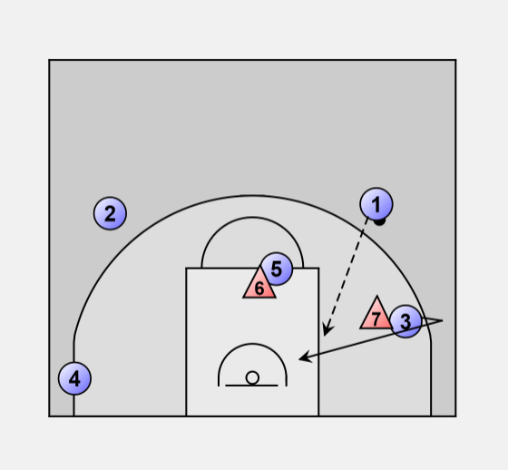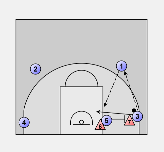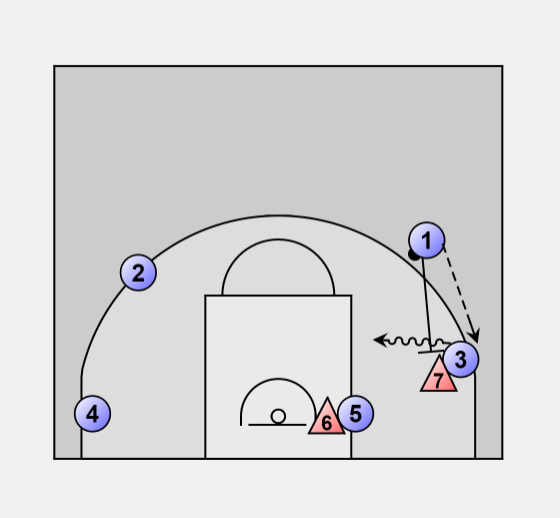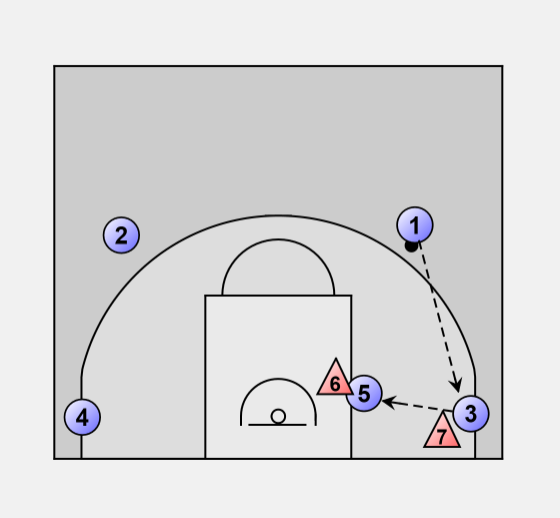 Ballscreen by perimeter players. 1 passes to 3 and then goes and sets a ballscreen pick on 7. 3 should be able to take the short jumper.