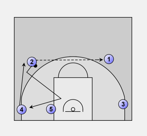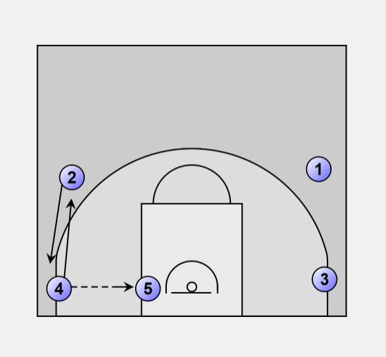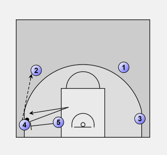 Backdoor. 3 can make a v-cut to act like he is getting open, but instead cuts hard backdoor. This should be done when the 5 is not in the low post so his man cannot help.