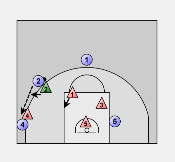 D2: Closes out on O2 and puts pressure on the ball, trying to force the ball to the corner.