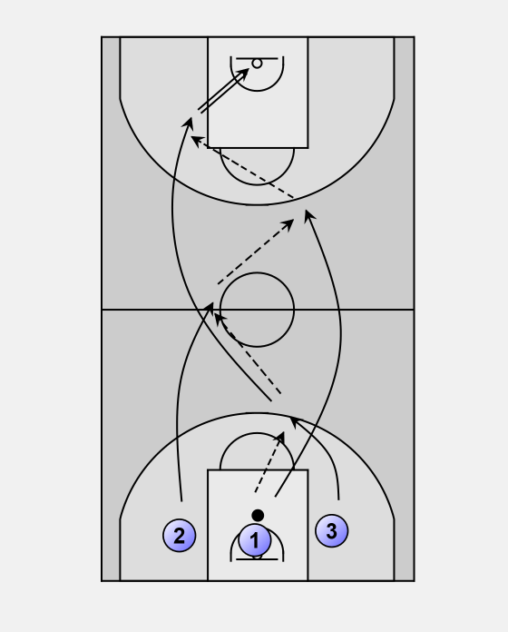 You line the team up in a tight weave. Player in the middle starts with the ball. They make 3 chest passes to get up the court and the 4th pass is a bounce pass to make the layup. You may need one bounce and two big steps for the layup. They run the same thing back with the ball not touching the floor after the layup. You put a 2 minute time limit on the first attempted layup. They need to make 22 layups in 2 minutes. You will have to adjust the makes to what you think your team can do.