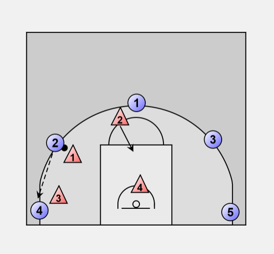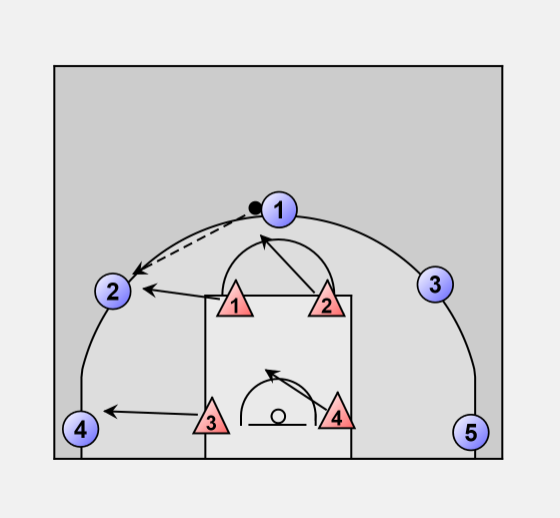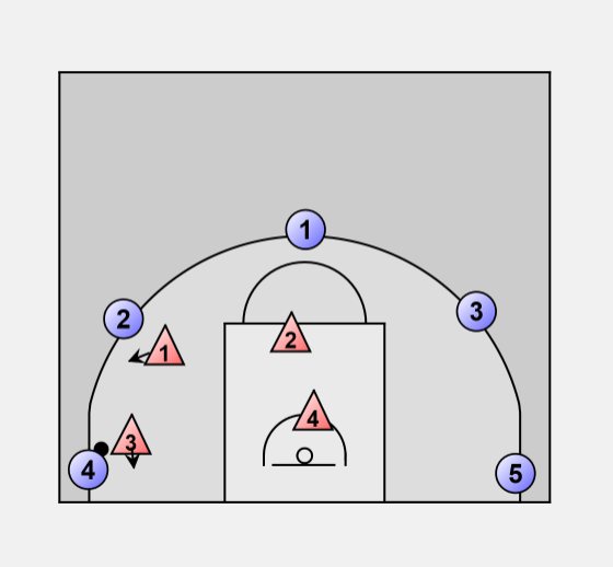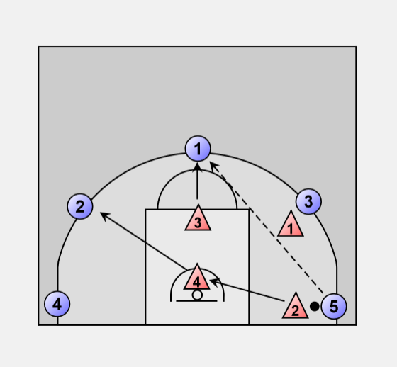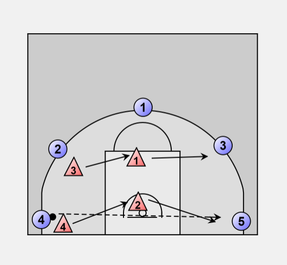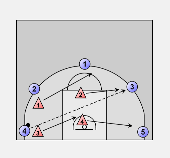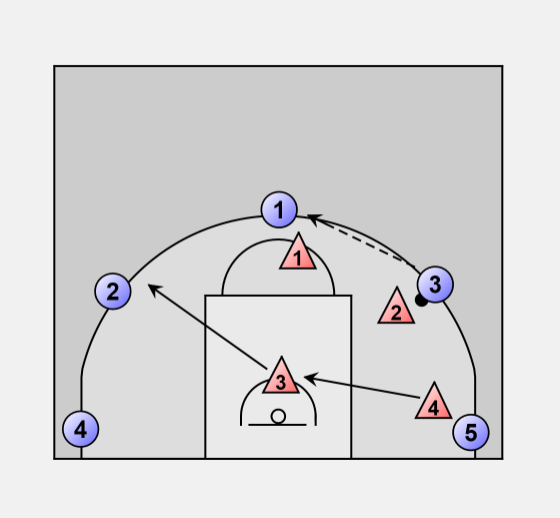 This process will continue until the coach specifies. Defensive communication is vital to this drill because the defense is shorthanded and at some point, each defender will guard several different players as the offense reverses the ball several times. So, not only must each defender call out "ball", "deny", or "help", he/she must also call out who is taking the ball on rotations where 2 defenders could potentially rotate to the ball.