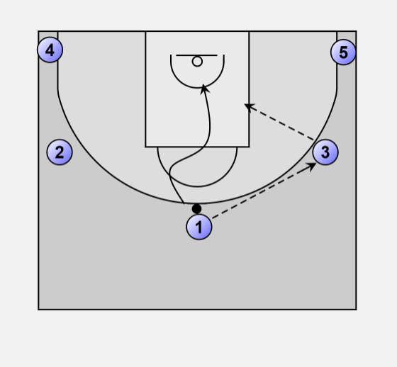 As 1 crosses the free-throw line, 2 cross-cuts looking for the pass from 3 and the drive or jump shot.