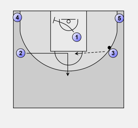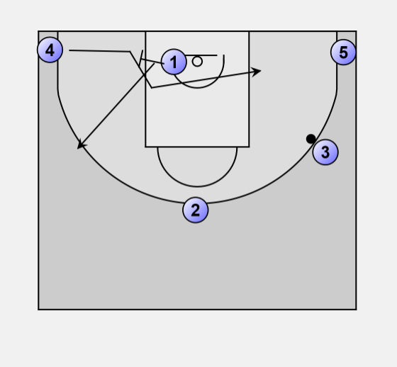 4 cuts across lane looking for pass from 3. If no pass comes he moves into post to see if he can get isolation play.