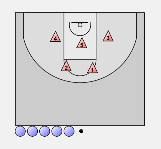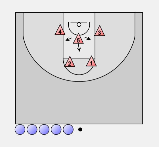 On a pass from the point guard to a wing, forward X3 comes out until guard X1 can get into position, then is "bumped" back by X1. The other guard (X2) slides over to the ball side elbow and centre X5 fills outside the low post.