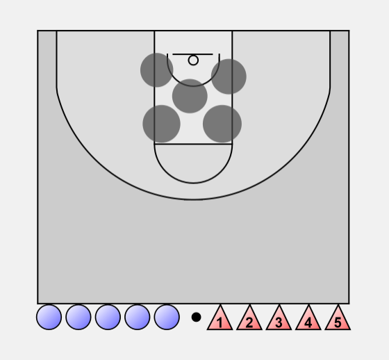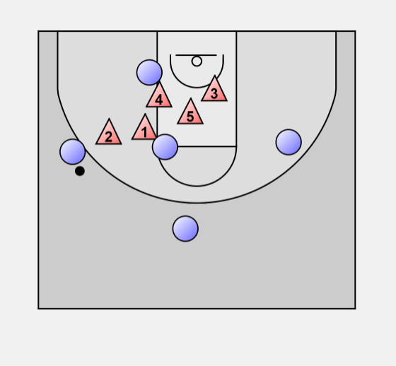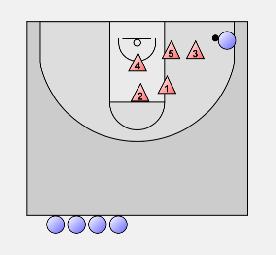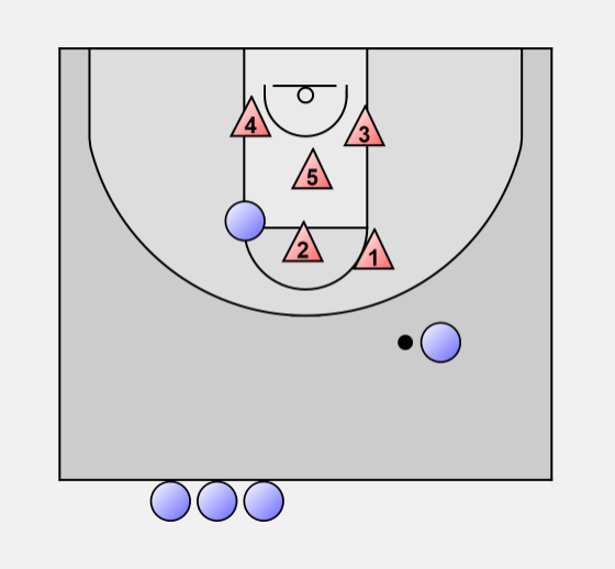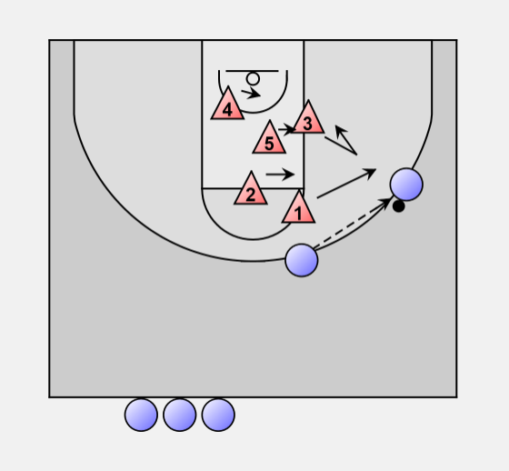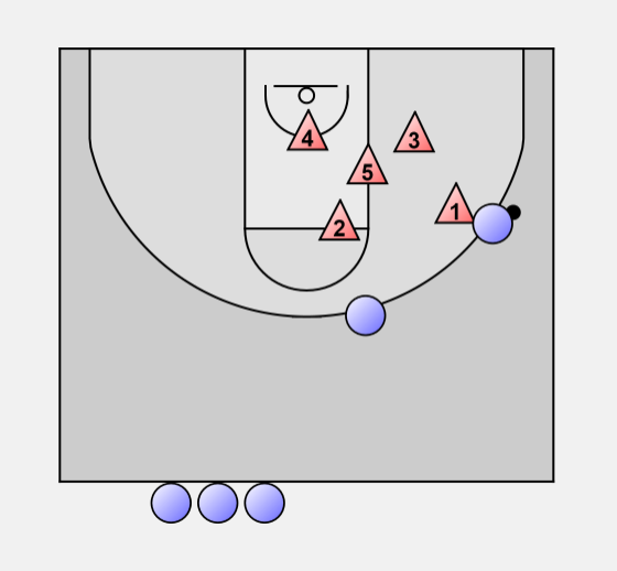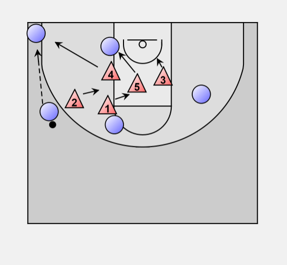 When an attacker dribbles down one side, the guard at that elbow steps out, the other guard slides across to the middle of the foul line. The other defenders also shift ball side.