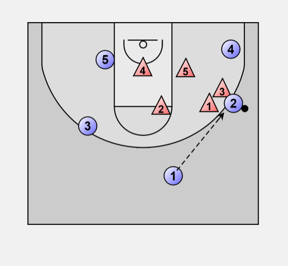 The other guard X1 could also come out to contest the pass back to the point guard, in which case the weak side forward X3 would rotate up to cover nearer the foul line, discouraging the skip pass to O2, or intercepting a soft, lazy "helium" pass.
