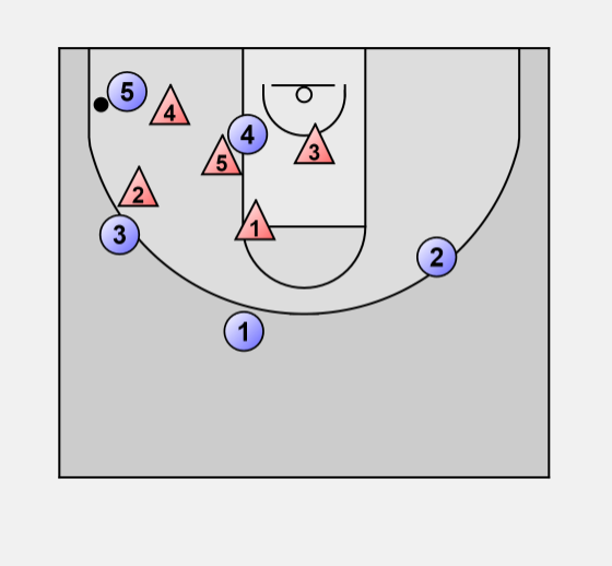 Here X4 contests the pass to O5 in the corner, rather than trap the ball handler with X2.